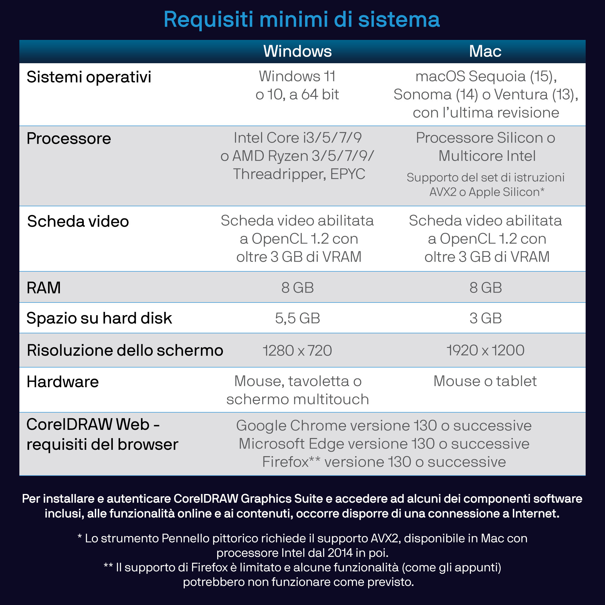 Disponibile per Windows, Mac e web, un abbonamento a basso costo garantisce un valore continuo con accesso immediato a nuove funzionalità esclusive, contenuti e supporto per le ultime tecnologie, inclusa una nuovissima versione basata su browser di CorelDRAW per una creatività flessibile in movimento. In alternativa, puoi scegliere di acquistare il software con un pagamento unico per avere la piena proprietà.